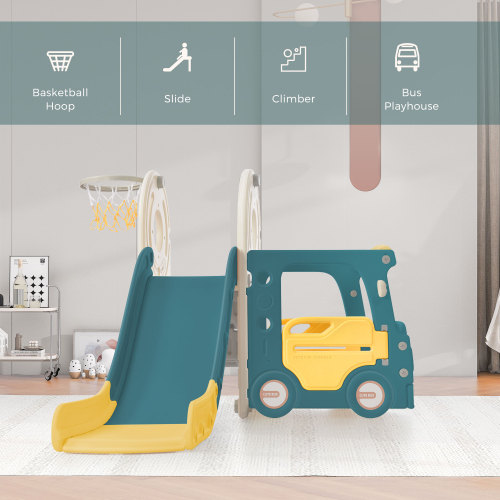 - The set includes a bus, a long slide, a basketball hoop and a matching basketball. Your kids can sit on the bus and feel like a real bus driver.